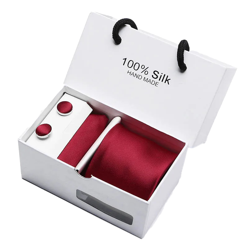 Crafted from 100% premium silk and meticulously handmade, the Leo Chevalier Red Tie Set introduces an element of bold sophistication to your accessory collection. The deep, luxurious red hue offers a powerful statement while maintaining an elegant flair. This tie set, complete with matching cufflinks and a pocket square, is a perfect choice for anyone seeking a refined, coordinated look suitable for a range of occasions.